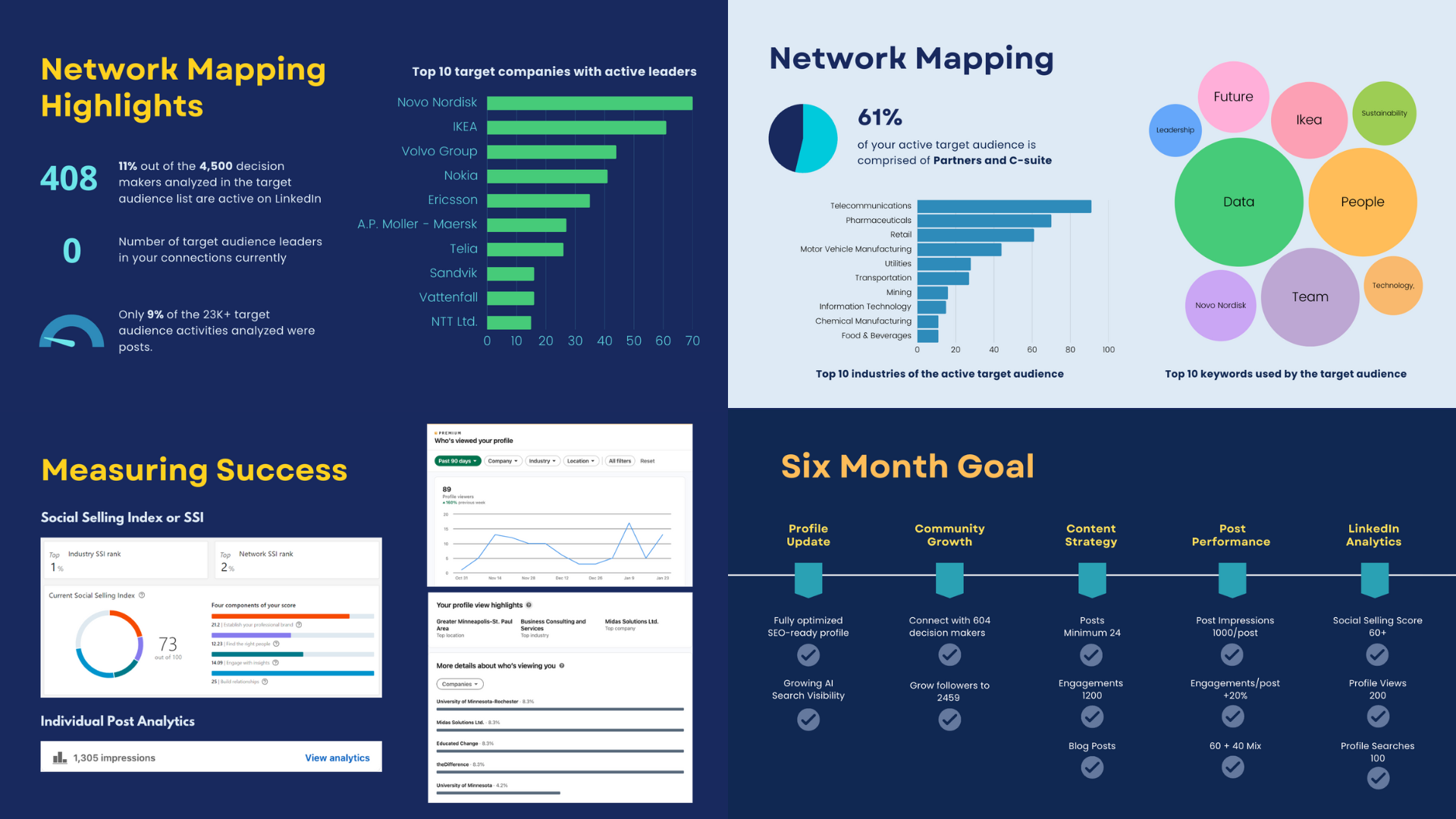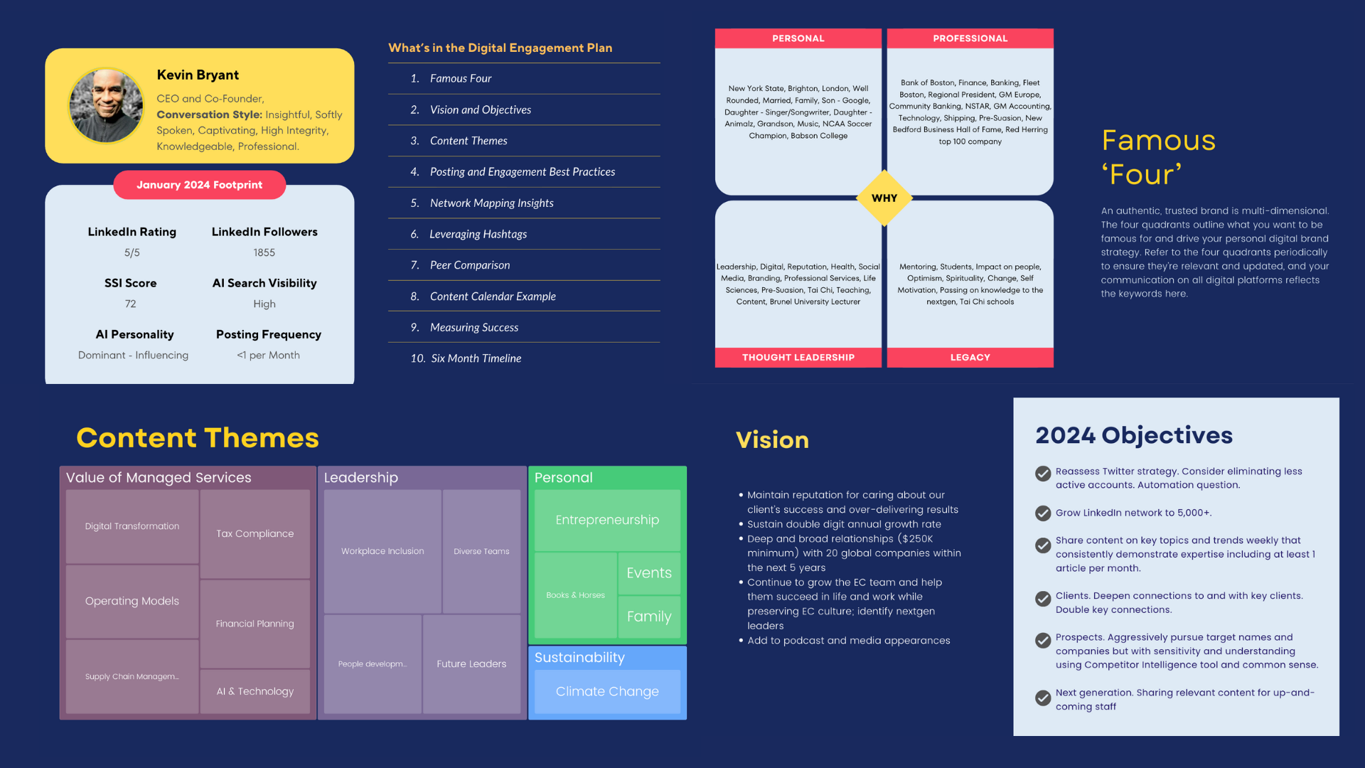 We help leaders clarify and articulate their unique identity in the digital space. Through deep listening and strategic reflection, we translate values, experience, and intent into a clear and credible LinkedIn presence. From profile optimization to narrative alignment, our work ensures that a leader’s digital identity consistently and authentically reflects their purpose, leadership style, and the legacy they want to build.